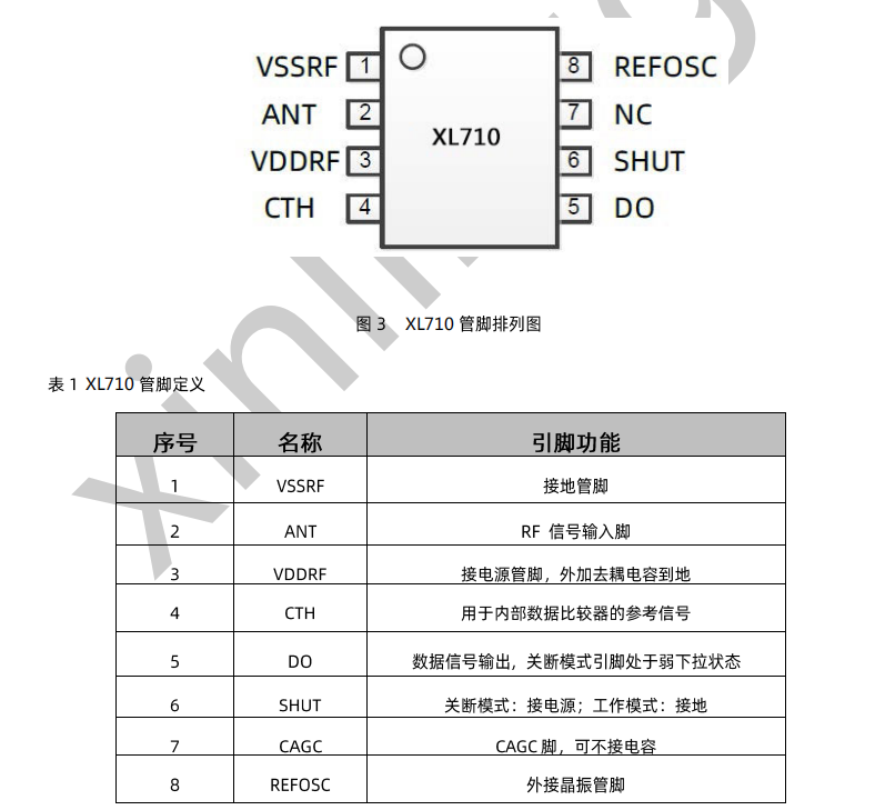 433/315无线接收芯片 XL710,工作电流3.5-4.0mA,适合做低功耗要求产品发表时间:2025-07-16 09:08 XL710是一颗高性能,低功耗的ASK/OOK射频(RF)接收芯片,可广泛应用于通信、遥控、物联网(IoT)等领域。XL710可工作在300MHz-440MHz频率范围,芯片正常工作电压范围2.0~5.5V,正常工作电流3.5-4.0mA,启动时间3ms,接收灵敏度最高可达到-114dBm,非常适合各种低功耗要求的设备等。XL710片内自动完成所有的RF和IF调谐,可以用最低的成本做到最可靠的接收效果。 XL710无线接收芯片接收特性: 频率范围:300MHz-440MHz 高接收灵敏度(2kbps,BER 10E-2) -114dBm @315MHz -115dBm @433.92MHz 低功耗: 3.5mA/3.3V @315MHz 4.0mA/3.3V @433.92MHz 0.01uA/3.3V @Shut Down Mode 超低启动时间:<3ms,适用于低功耗要求产品 数据速率:≤10kbps SOP8封装 |