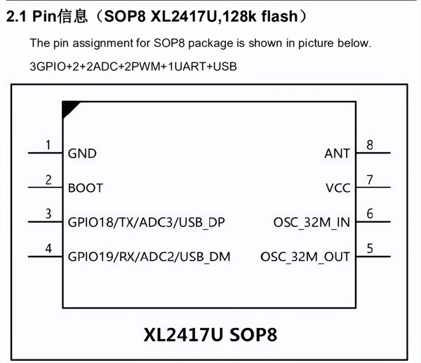 不到一块钱的带USB 2.4G收发 SOC芯片,集成2.4G射频 32位MCU发表时间:2025-11-12 11:39 XL2417U 是一款在成本、集成度和性能方面都非常有竞争力的 2.4GHz RF SoC芯片,内置高性能2.4GHz射频收发器,灵敏度高达-96dBm,输出功率最大13dBm,通信稳定可靠。带32位ARM核主控,运行频率高达64MHz,搭载128KB Flash 和 48KB RAM。芯片内置USB 2.0全速接口、UART、I²C、PWM、ADC等接口。 XL2417U一颗芯片就整合了主控MCU、2.4G射频、USB接口三大核心功能。传统方案可能需要多颗芯片才能实现,而XL2417U单个芯片即可搞定,采用SOP8封装,批量价不到一块,显著降低了BOM成本和PCB面积。XL2417U可应用于HID设备,智能家居和消费电子等领域。 XL2417U芯片特性: 价格:批量不到 1块钱 内核:32位 ARM MCU,最高 64MHz 存储:128KB Flash + 48KB RAM(另有64KB ROM) 输出功率:最大13 dBm 射频:2.4GHz 收发器,支持 BLE 接口:USB 2.0全速、UART、I²C、PWM、ADC 功耗:睡眠模式电流1.6μA,待机模式4.8uA,RX 10.2mA,TX 9.5mA SOP8封装 最多 3 个GPIO 支持 OTA 升级 XL2417U 是一款高性价比的 2.4G SoC芯片,集成了2.4G射频,ARM核主控,128k Flash,48K Sram,USB,ADC和PWM,资源大,性能优秀,支持 2M/1M/250K/125Kbps 多种速率。适合对成本敏感、对集成度和功耗有要求的消费类无线产品。 |