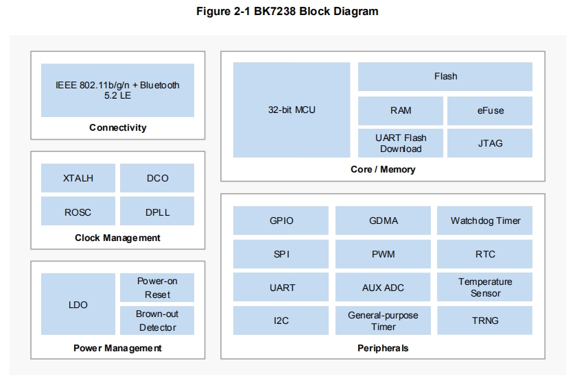 BK7238 是一款高度集成的单芯片 Wi-Fi 802.11b/g/n 和蓝牙 5.2 低功耗(LE)组合解决方案,芯片支持四种低功耗模式,专为需要低功耗和紧凑尺寸的应用而设计。BK7238集成了高性能 32 位微控制器以及多种外设和接口,是物联网(IoT)应用的理想选择。